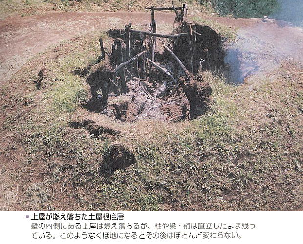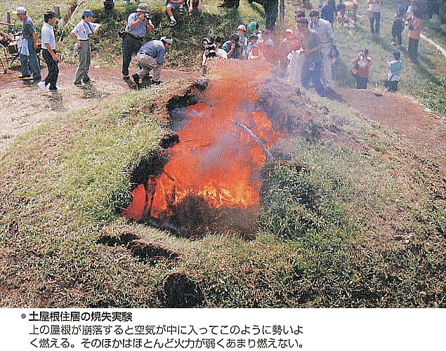 またこの遺跡では、実験的に復元した土屋根住居を実際に焼失させ、出土したものと比較しているが、まったく出土時と同じ状態だっ