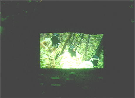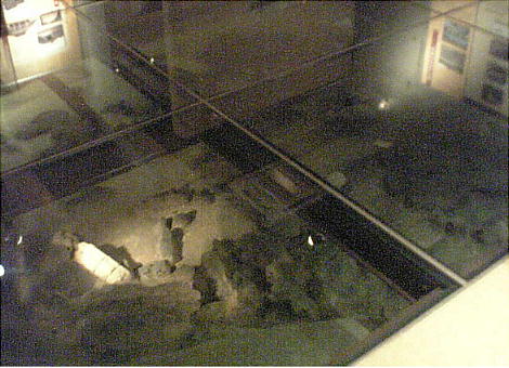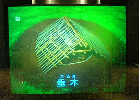 失住居の保存された遺構が現れる。出土した状況のままで保存され展示してある。発掘時の状況や住居復元の様子や特徴を、モニタ