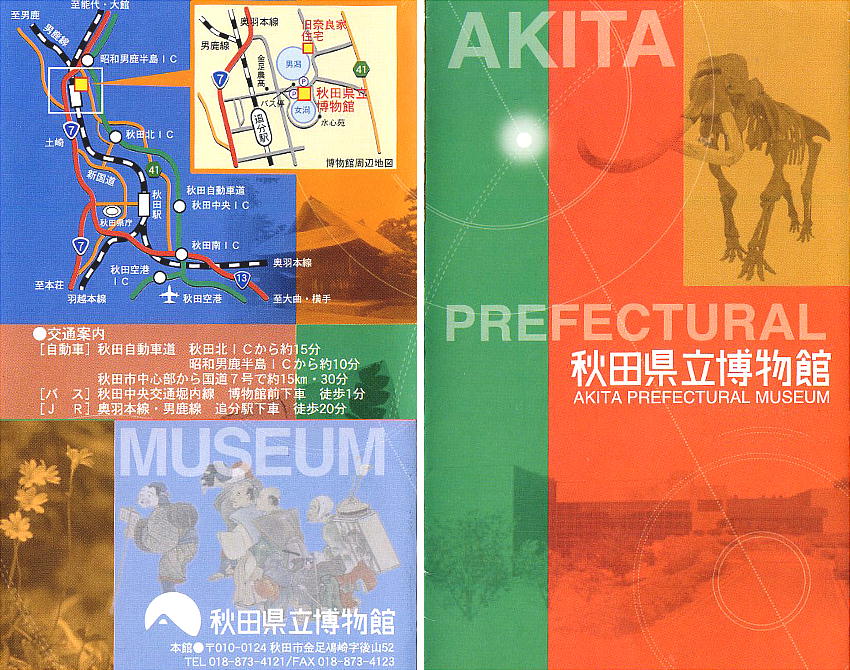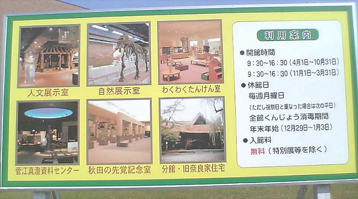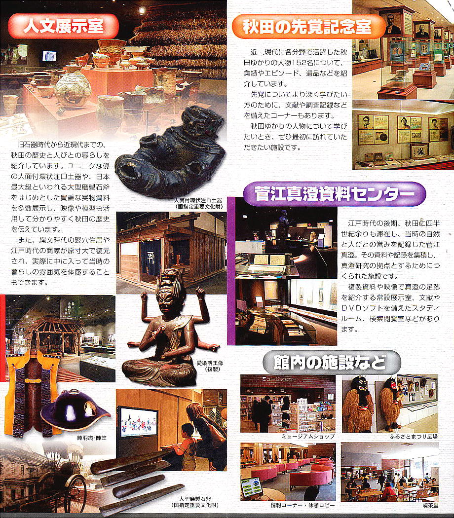秋田県立博物館は、考古・歴史・民俗・工芸・生物・地質の6部門と、「菅江真澄資料センター」・「秋田の先覚記念室」からなる