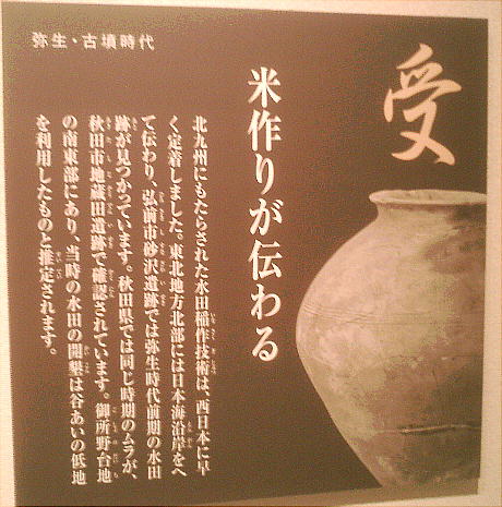 砂沢遺跡や垂柳遺跡で発見された稲作文化の痕跡は、ほとんど弥生時代の初めである。西日本に稲作が根付いた頃、もう北東北にも