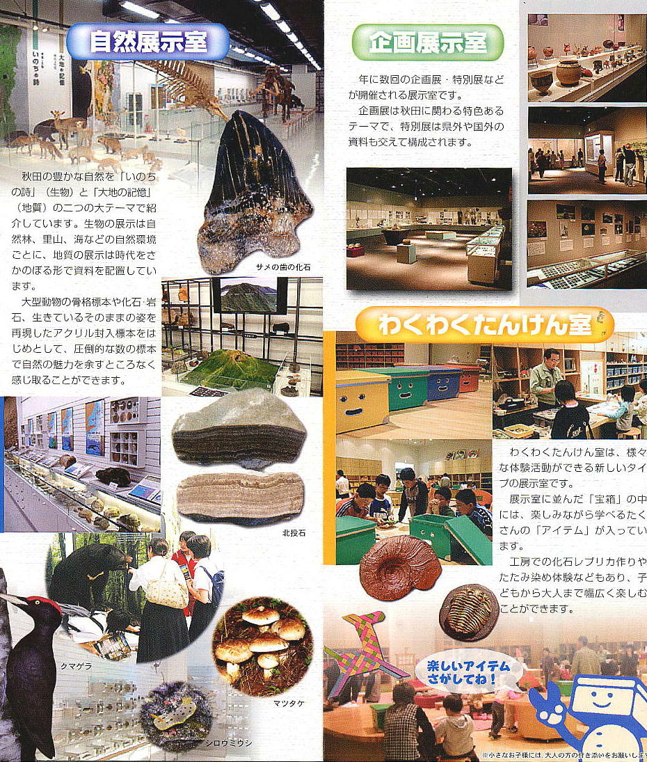 地質の展示は46億年前の地球の誕生から現代に至る秋田の大地の形成を時間軸に沿って展示している。自然展示室ではできるだけ多く