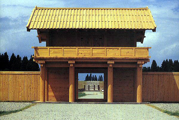 外柵南門を通して政庁域を見る(復元:秋田県教育庁払田柵跡調査事務所)