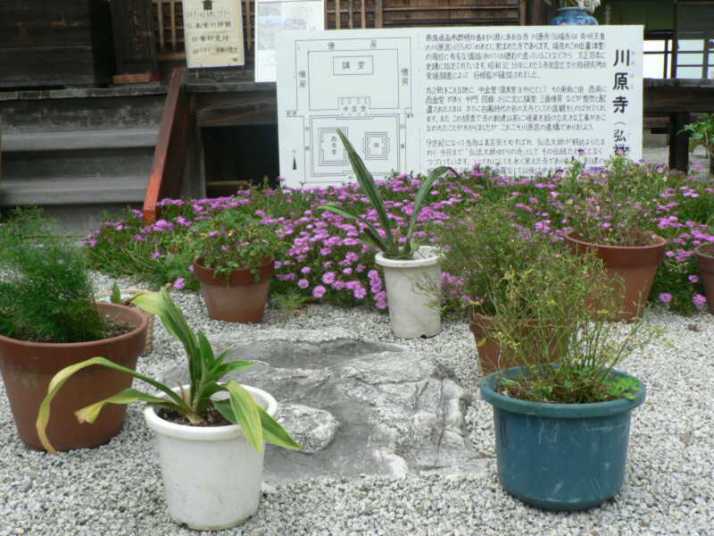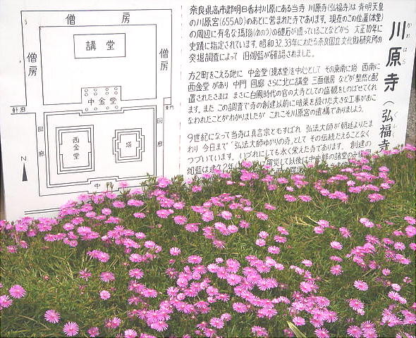 ●川原寺(弘福寺)・・・飛鳥時代に飛鳥寺、大官大寺、薬師寺とともに飛鳥四大寺に数えられた官寺。7世紀頃の創建と考えられてい