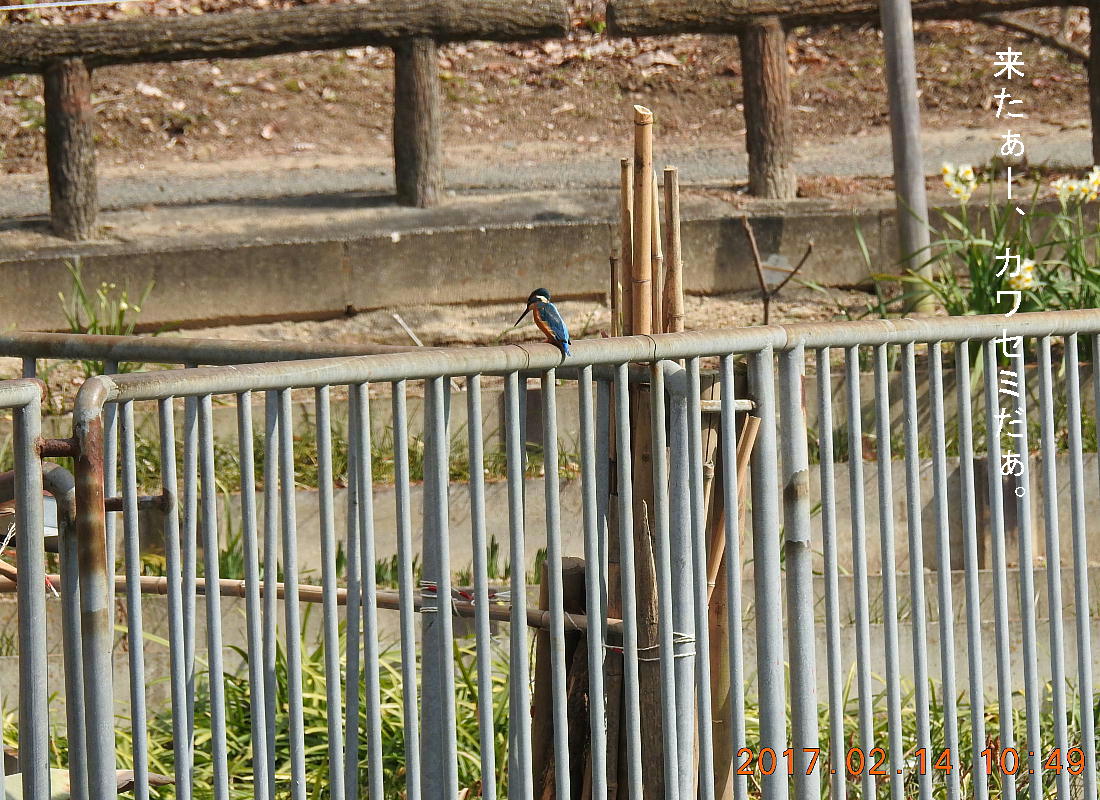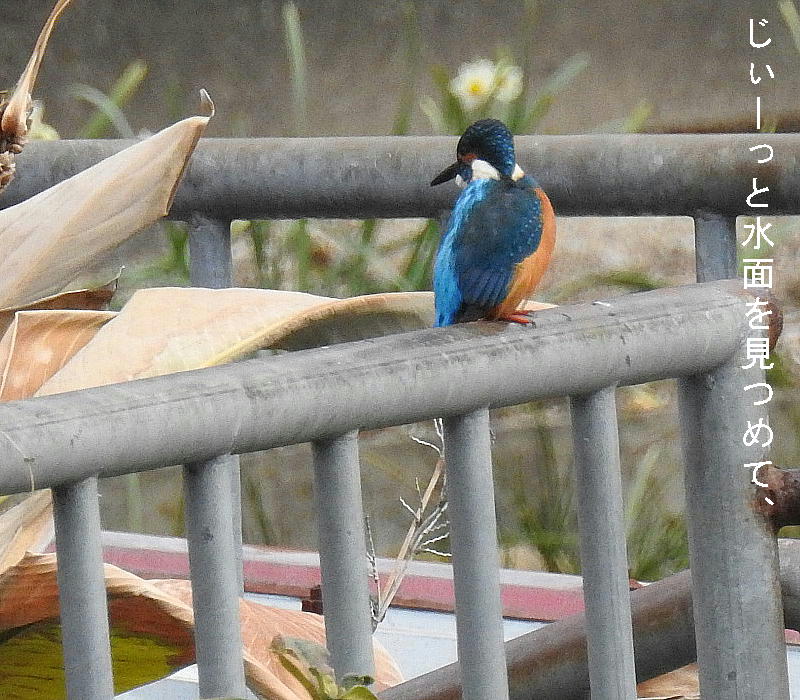 池の周りを歩いていると、水面を向こうから青い鳥が、滑るように飛んできて鉄柵にとまった。カワセミ