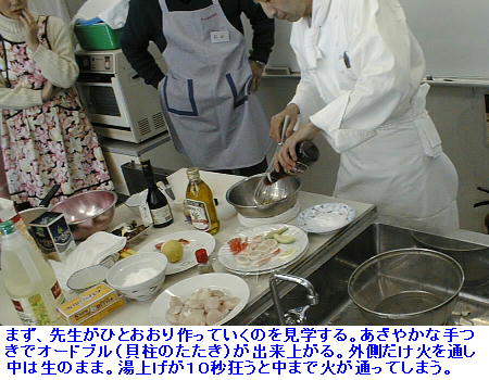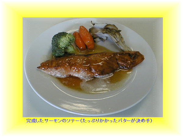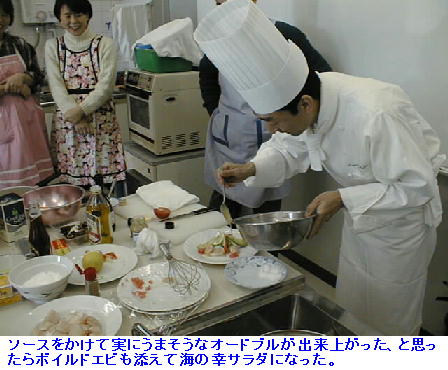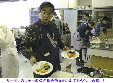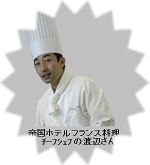 1998年の1月、近所の公民館で事務を手伝っている嫁はんから、「今度公民館で男の料理教室をやるから参加しない?」とお誘いが あった。正直なところ、「かったるいなぁ、めんどくせぇ。」と思ったけれど、日頃ご迷惑ばかりかけている当方としてはむげに断 るわけにもいかず、「そうやねぇ、フーン、おもろいかなぁ」などと曖昧に返事していたら、当日になって「今日料理教室よ。10 時に来てね。」と言われて「アリャリャ、やっぱり参加せんならんのか」とバタバタ参加した。「どっかのシェフが講師に来るって。」 と聞いていたが、まさか帝国ホテルのチーフ・シェフとは考えもしなかった。渡辺さん。もの静かな語り口の、やさしそうな人だっ た。生徒は近所のオッサンばかり。中には同じマンションの顔なじみもいた。本日のレシピは、海の幸のサラダとサーモン・ステー キ。参加費1,500円也。