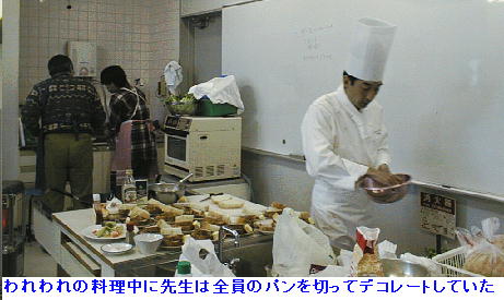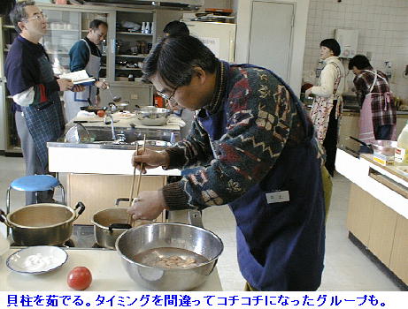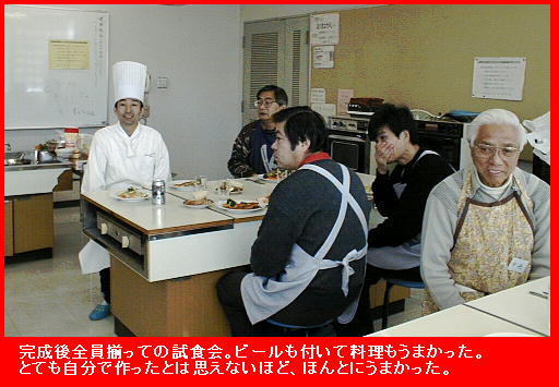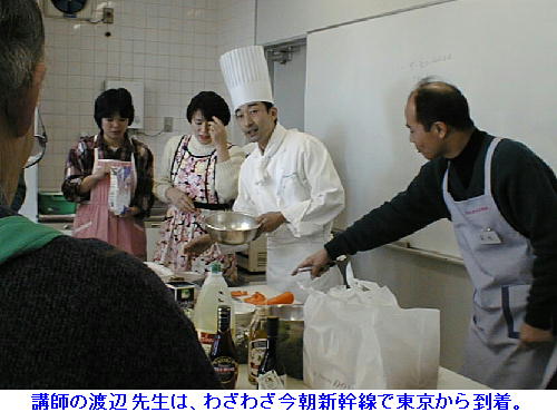 しぶしぶ行った教室だったがわりと面白かった。カレーしか作れないわたくしとしては、なるほど、なるほど、こうすればいいのか と結構学ぶべき所があった。レシピに忠実につくれば割と簡単にできるものだという事も知った。しかし、これを毎日毎日、家族の ために作らねばならないとなると、とても自分には主婦はつとまりそうもない。 近頃 男の料理 がはやっているが、私に言われれば所詮道楽だ。毎日家事としてやらねばならないとなると、とても絶えられない。 誰かが作ったものを食べるほうが楽だ。奥様、嫁はん、山の神、ありがたや、ありがたや。 渡辺先生は、我々が試食している最中に、新幹線の時間があるからとそそくさと東京へお帰りになった。ありがとうございました。