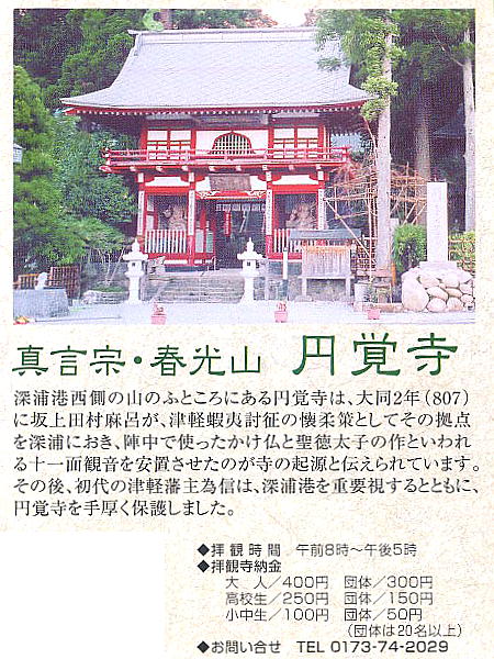 深浦港西側の山ふところにある円覚寺は、大同2年(807)に坂上田村麻呂が津軽蝦夷討征の懐柔策としてその拠点を深浦におき、