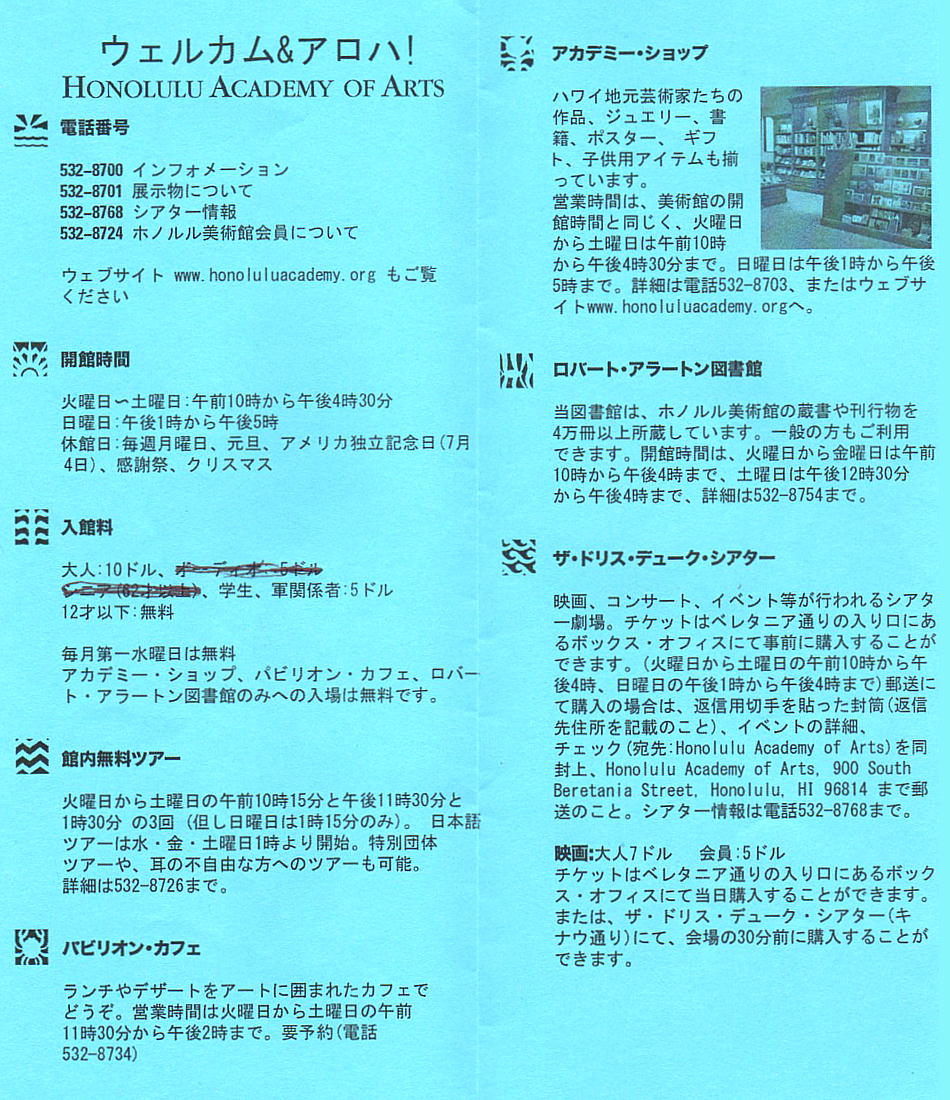3歳以下、ホノルル美術館メンバー:無料
