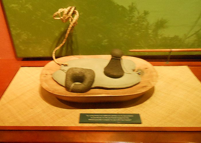 丁寧に磨き上げられた一艘の巨大なアウトリガー・カヌーが展示されている。これだけのカヌーを、クギを使わずに作り上げたポリネ