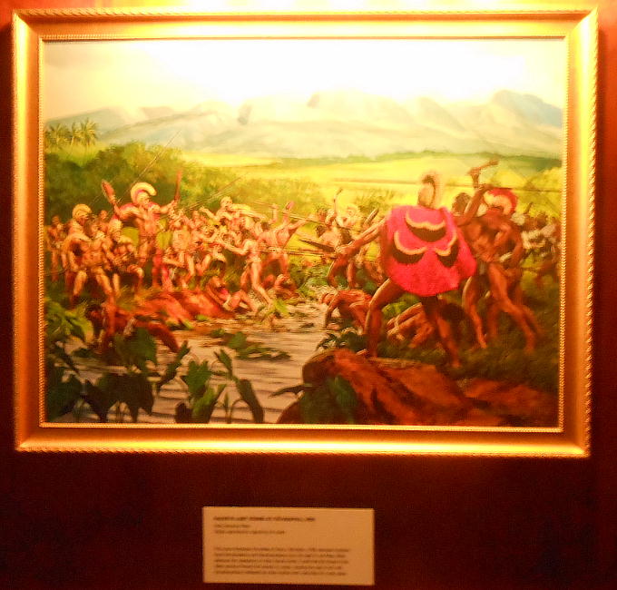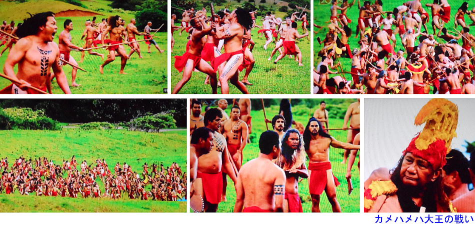 初めて王朝を築いたのがカメハメハ1世なのだ。下の絵はその戦いを描いた図である。頭部には戦いの神「クー」をかたどった帽子を