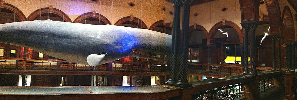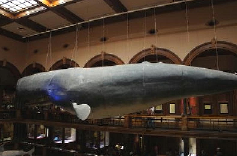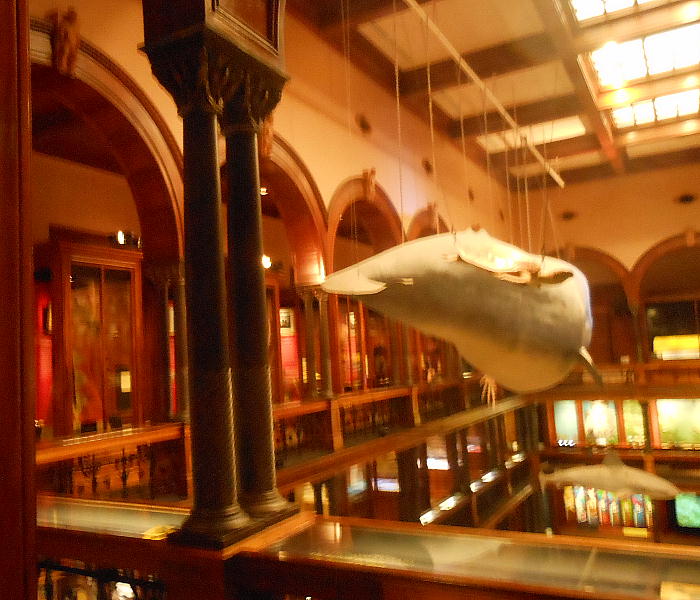ハワイアン・ホールの天井には18メートルもあるマッコウ鯨の標本がぶらささがる
