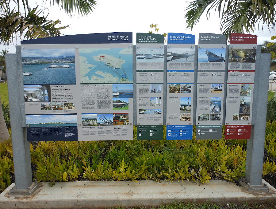 海を挟んでパークの向こう側に、「アリゾナ記念館」「ミズーリ号記念館」が見えているが、もう歩き疲れて湾の向こうまで行く気が