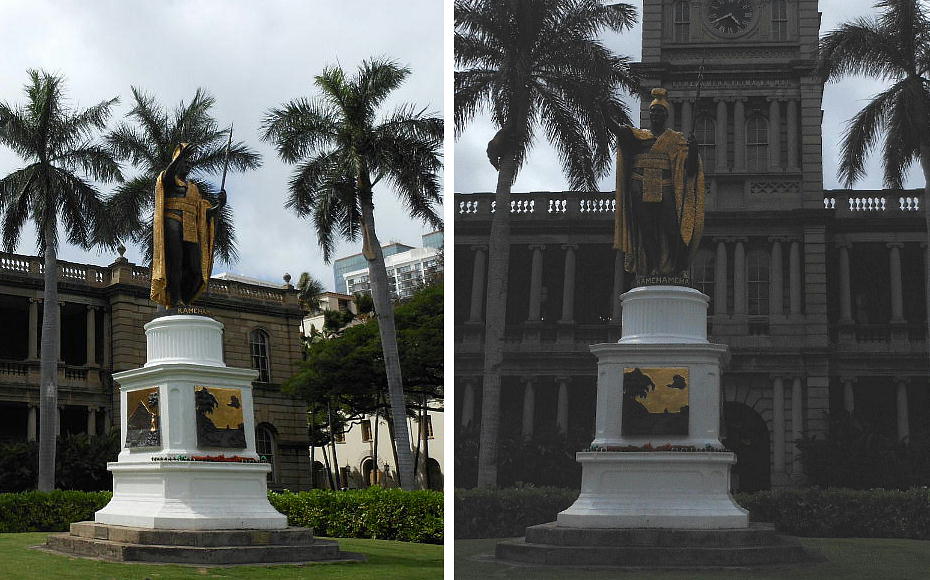 カメハメハ1世の像は、現在ハワイ州内の3箇所にある。最も有名なのは、ホノルルのダウンタウン、アリイオラニ・ハレ(ハワイ州