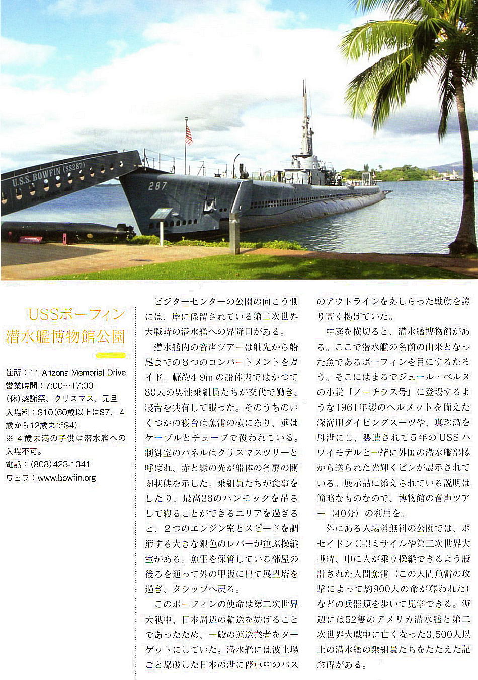 U.S.S.ボウフィン潜水艦博物館は、アリゾナ記念館の隣にある、ボウフィン号という潜水艦館内を博物館にした、潜水艦にまつわる