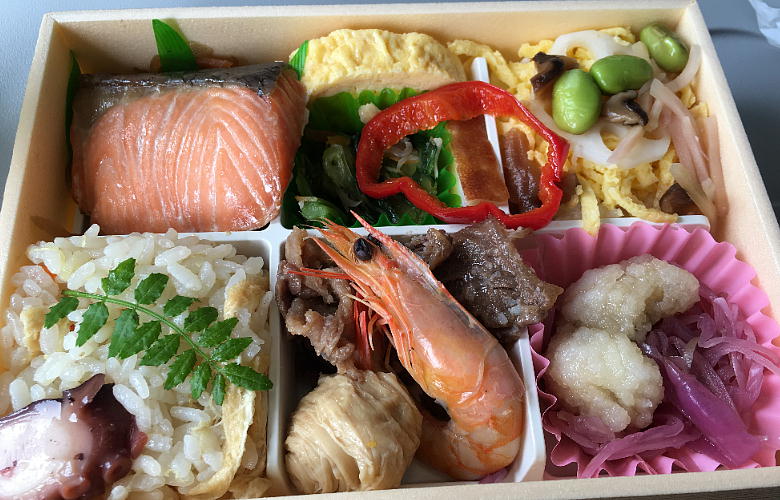 機内へ入る前売店で弁当を買った。私は有名な何とか稲荷の6ケ入を食ったが、嫁半はえらく豪華なモンを食っていた。