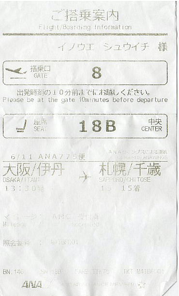 12:00頃、年休消化のため休んだという哲平が伊丹空港まで送ってくれる。ANA776便。13:30発、15:15千歳空港着。