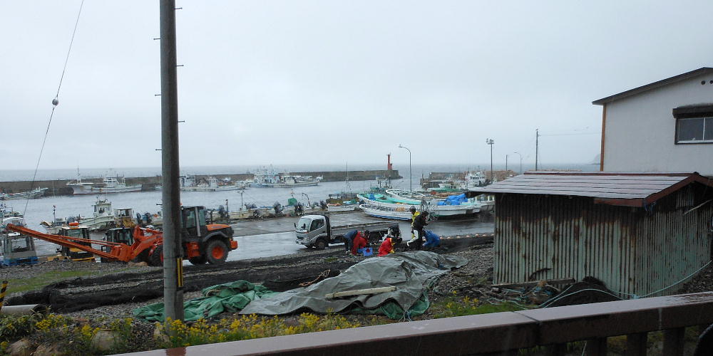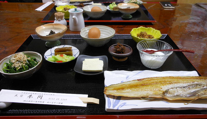 7時頃宿へ戻り朝食。女将さんの説明を聞きながら、ホッケの開き、ホヤ、蕗、等々を食す。昨夜のキンキ、