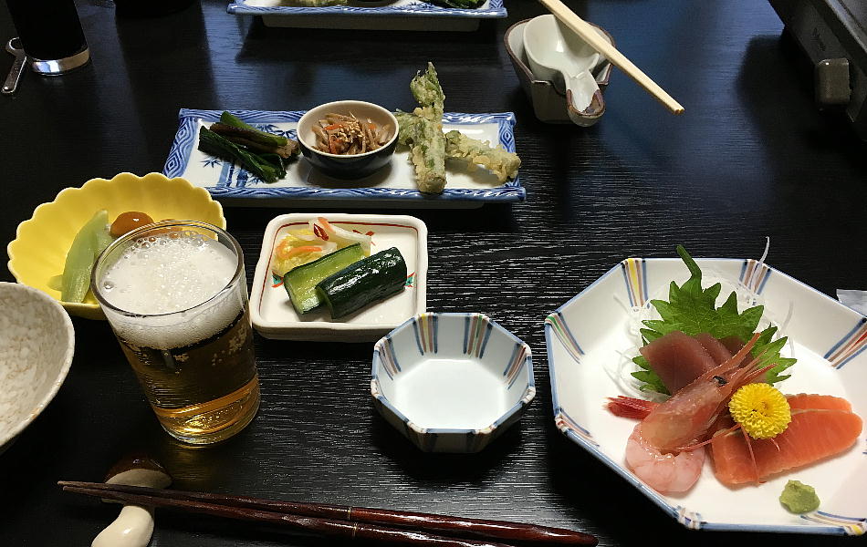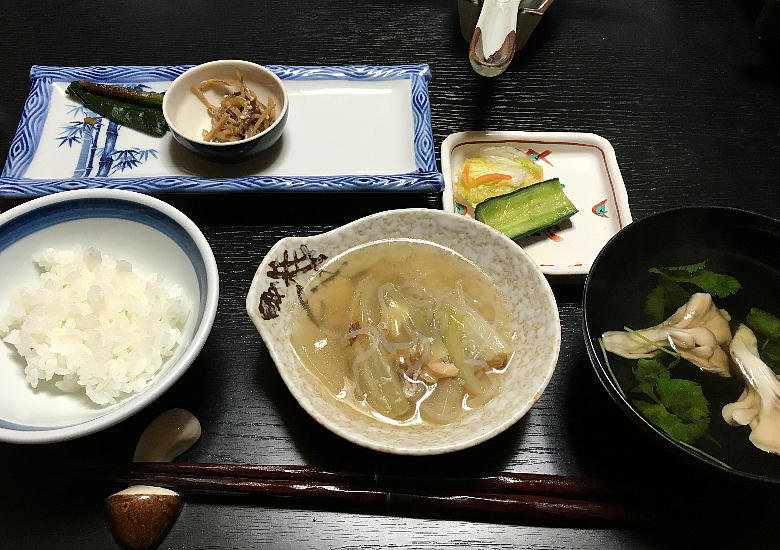 らけ。昨夜の羅臼では全く野菜が出なかったので、今夜は野菜が旨い。部屋の名前も「まつたけ」だった。