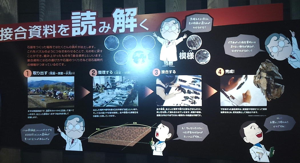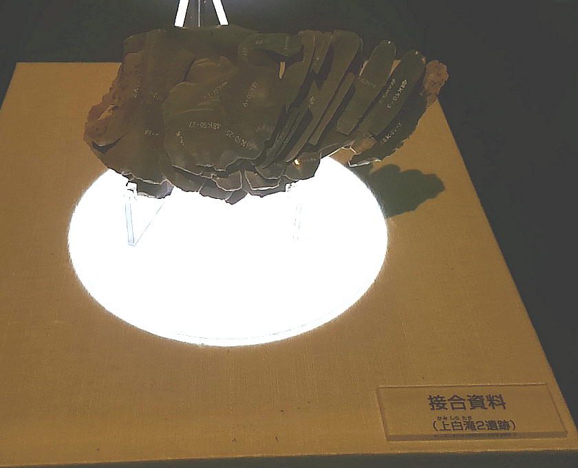 際に生じた石の破片を1つ1つつなぎ合わせて、元の形に可能な限り復元した「接合資料」があります。