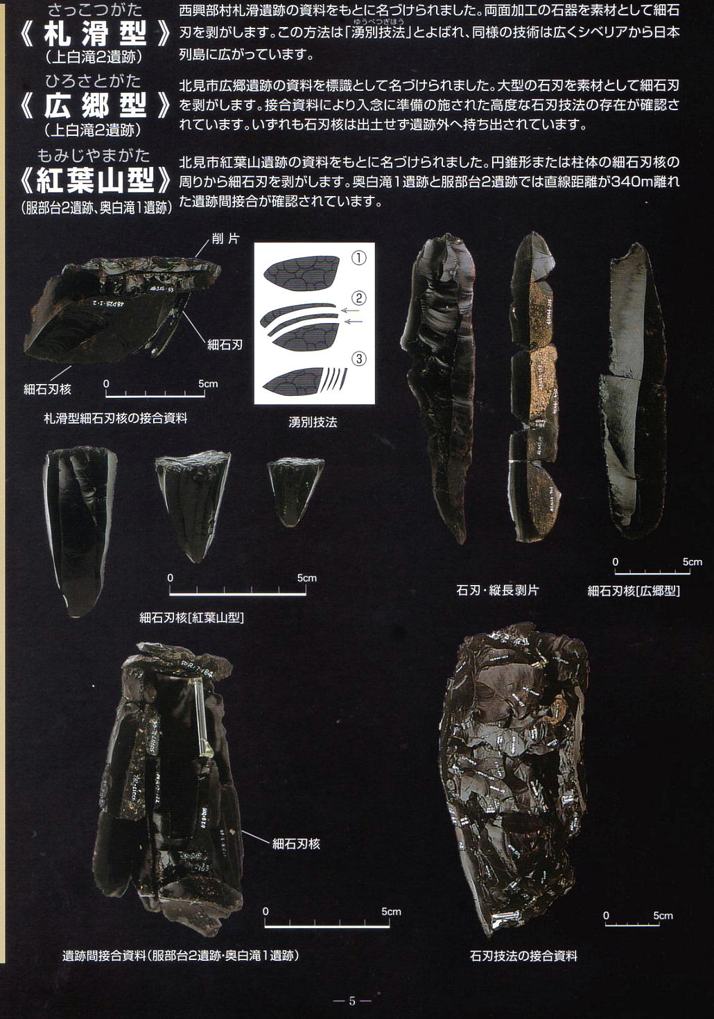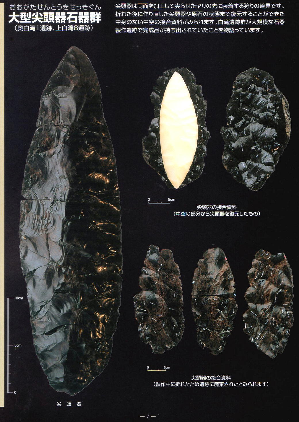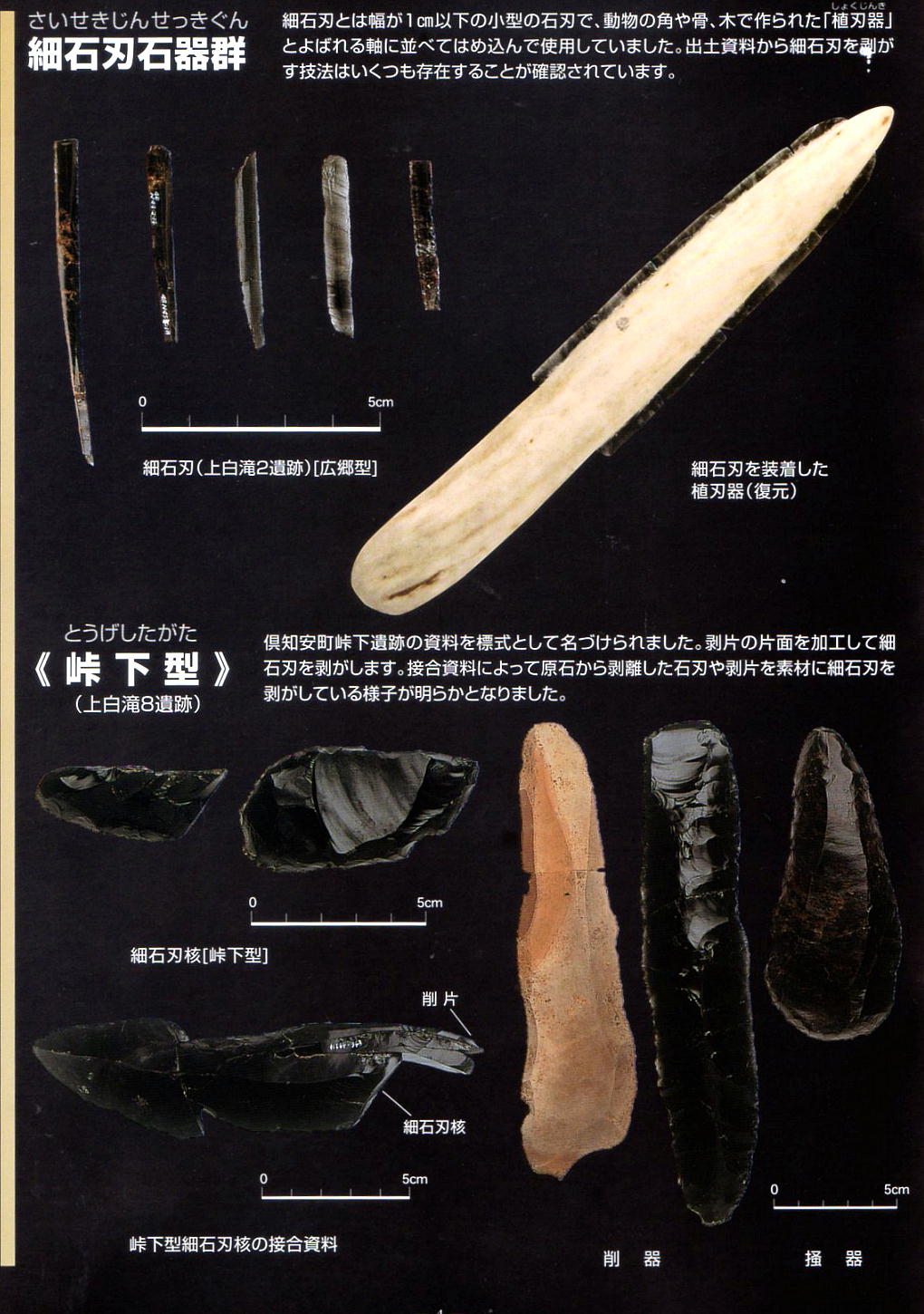 大型両面調整石器、舟底形石器などが多く、各種の細石刃核もあり、それらの石器の接合資料が多数得ら