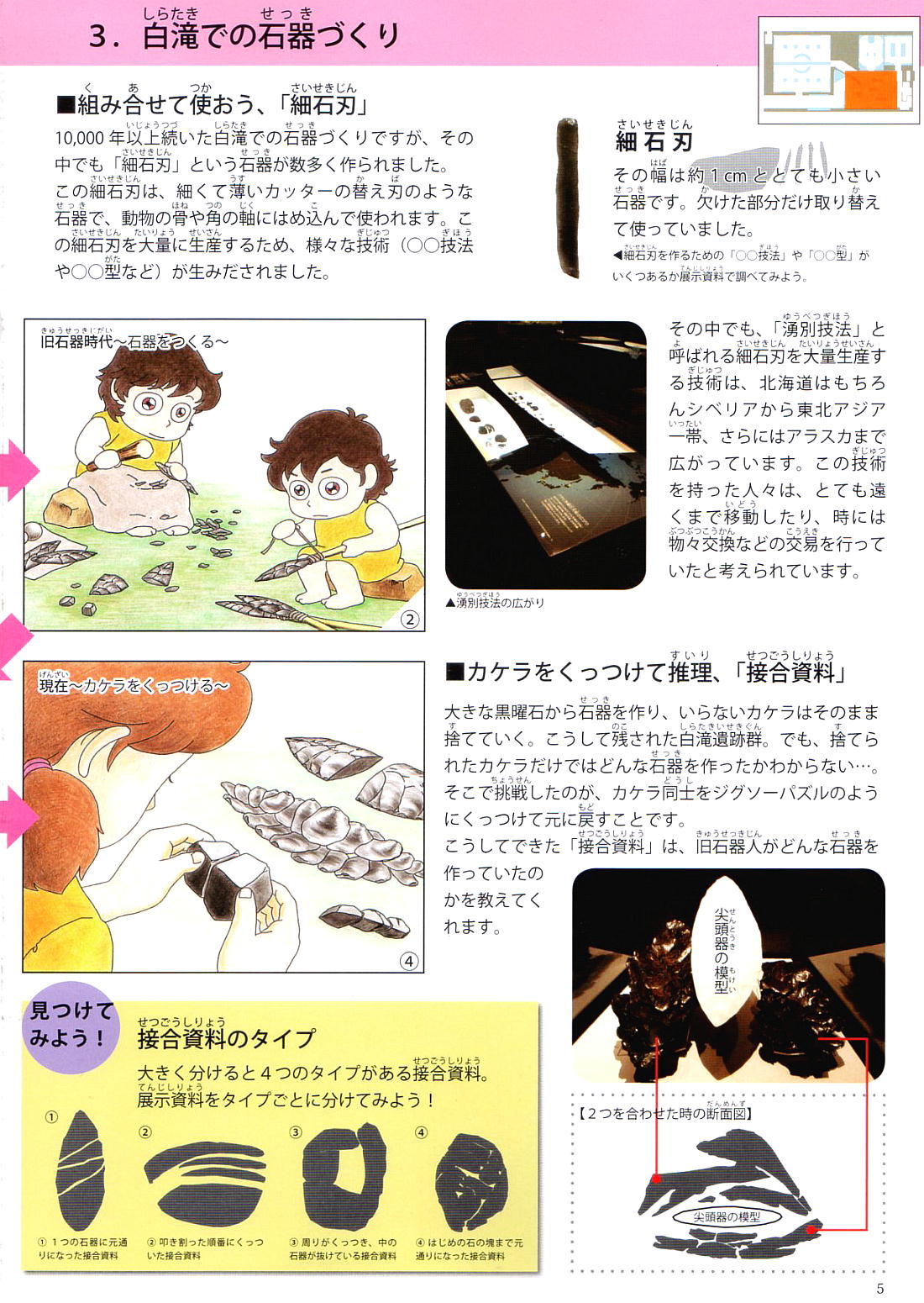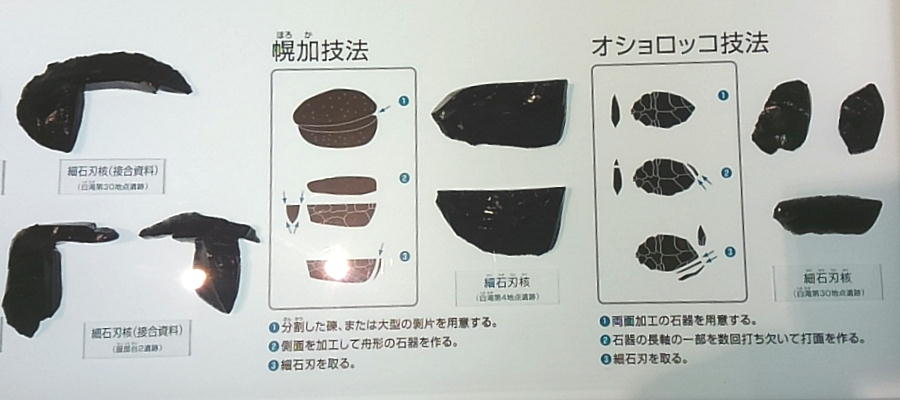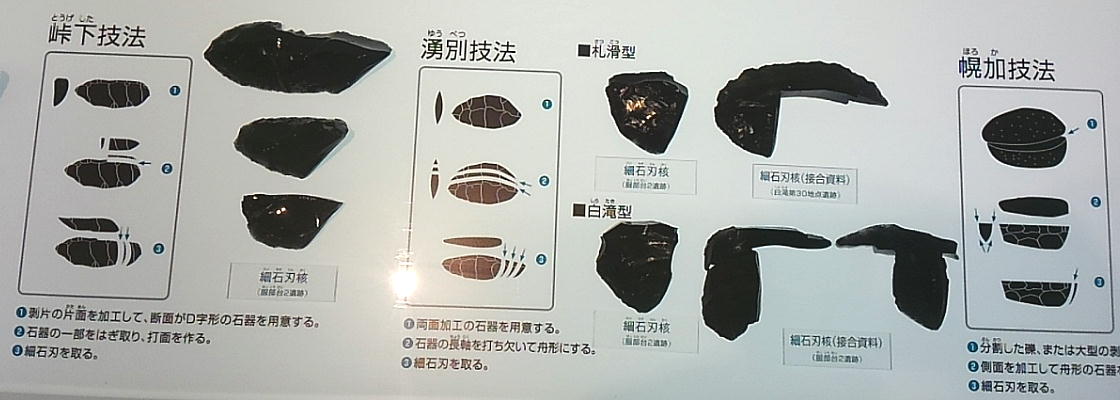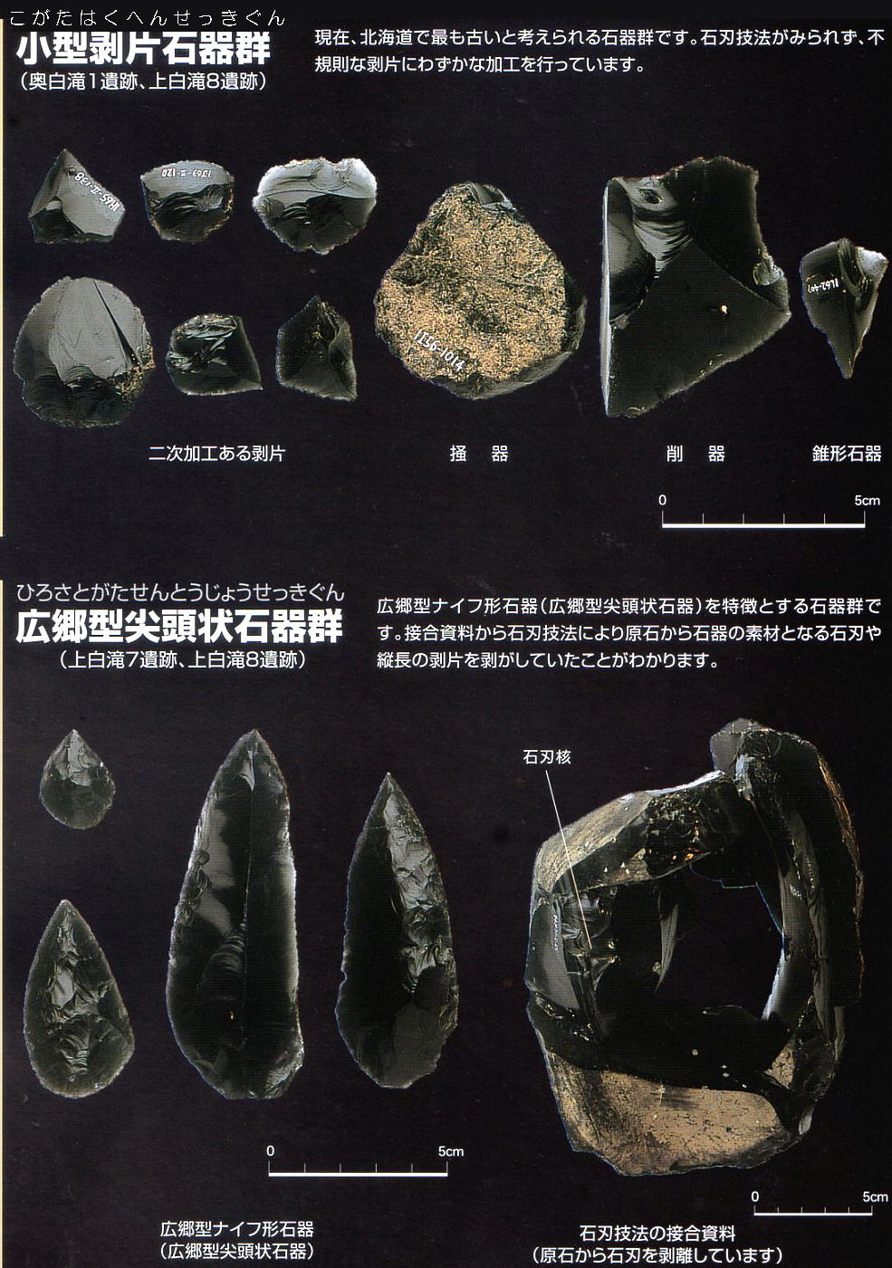 大型両面調整石器、舟底形石器などが多く、各種の細石刃核もあり、それらの石器の接合資料が多数得ら