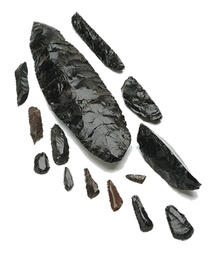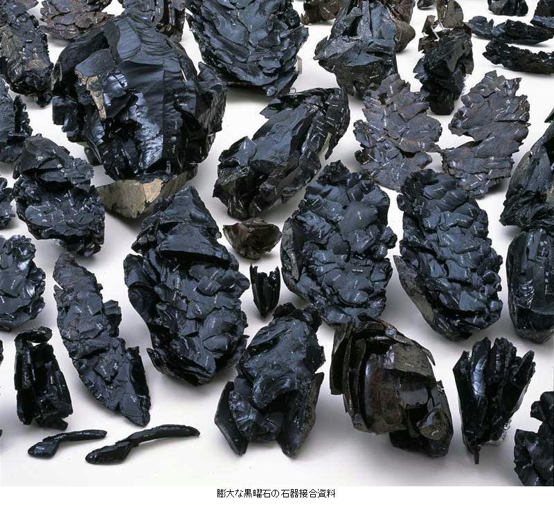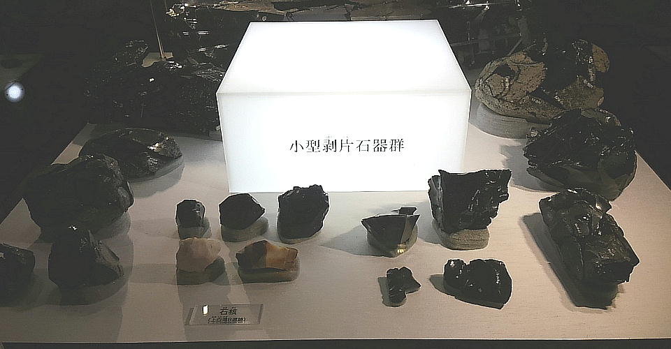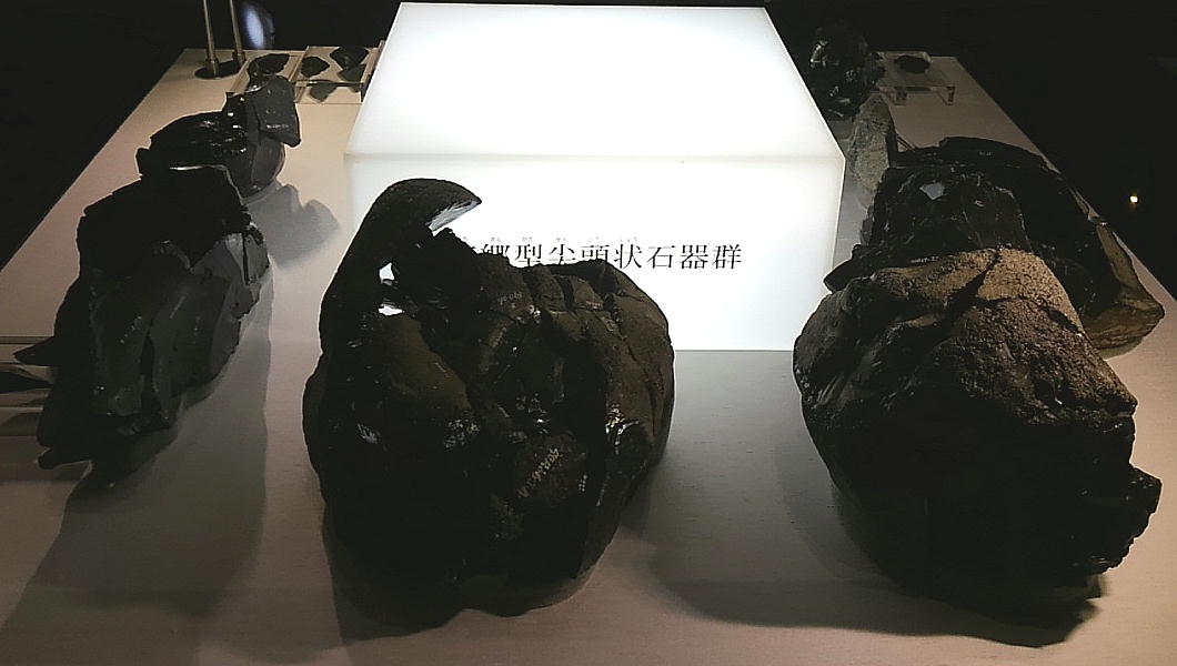 黒曜石原産地の赤石山山麓に広がる河岸段丘上に形成された遺跡群からの出土品。原石から石器を製作