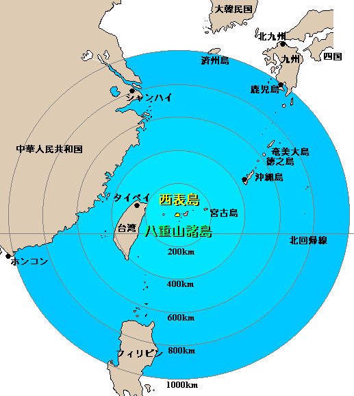 2,100q、沖縄本島から約460q、中国大陸との距離は約440q、台湾へは約200qと沖縄より近く、緯度的に