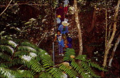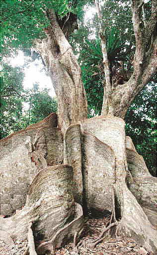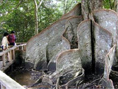 流域のサキシマスオウノキはマングローブ林後方に生えるのが特徴で、高さが約20m板根の広がりが126.5平方m