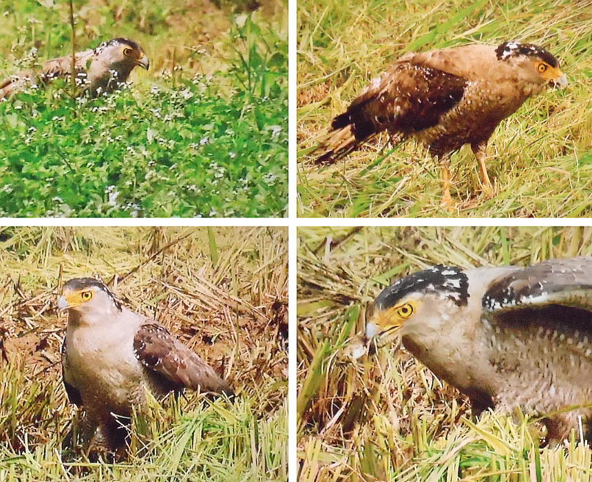 カンムリワシは地上でも獲物を探すようで、これは野原でカエルを捕まえている図