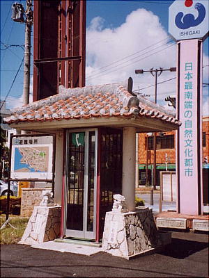 上空から見た石垣島(上左)と石垣港の電話BOXと案内塔。