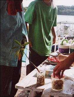 カヌーを漕ぎながら流れてきたマングローブの種を拾って、整理するインストのお姉ちゃんとマイドーター。種は葉巻を