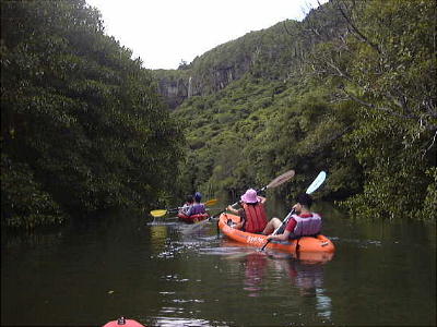 カヌーもここから上陸できる。サキシマスオウもマングローブの種類で、一番高く成長するのは最も内陸側に生えるオヒ