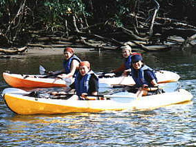 L2人組の計6名で、それぞれ2人乗りのカヌーに乗り込んで、インストのお姉ちゃんも入れて4艘で仲間川を遡る。