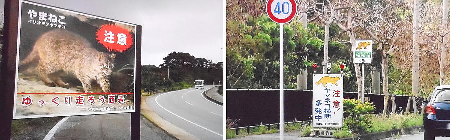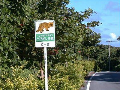 道路の至る所に「イリオモテヤマネコに注意!」の看板が立っている。イリオモテヤマネコは、