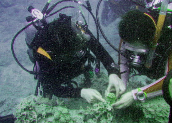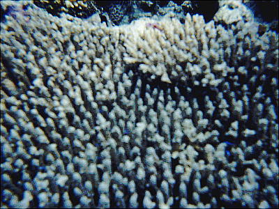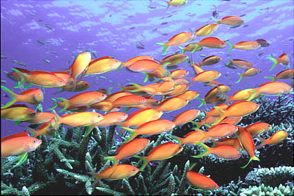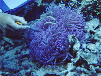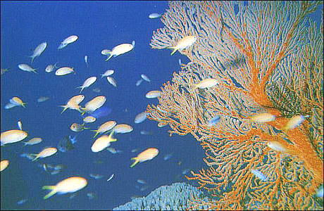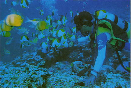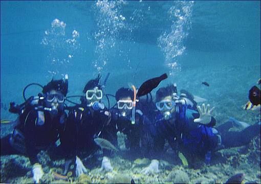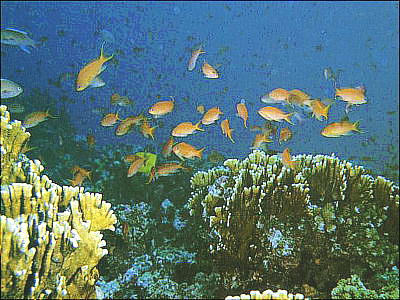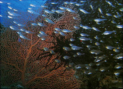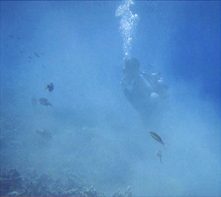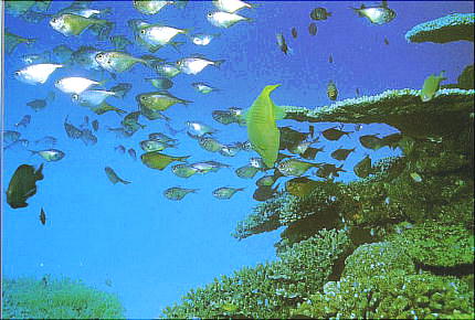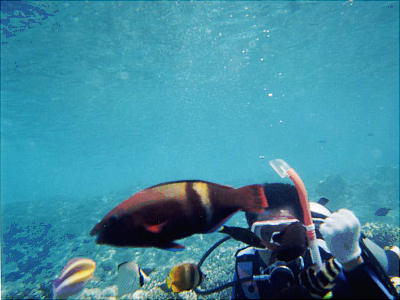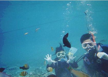 き、3,4mの所で珊瑚礁とそこに集まった魚たちを観察する。TVで見る赤や青、黄の魚たち