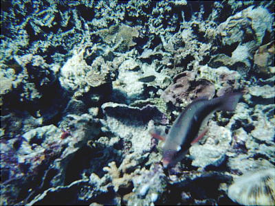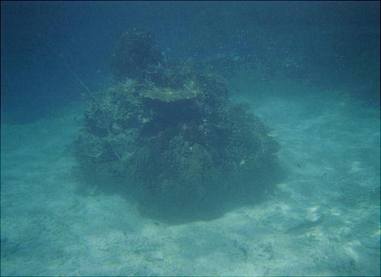 ちょっと深そうな所に、緑の大きな岩礁があってサンゴが一杯付いているので、そっちへ行きか