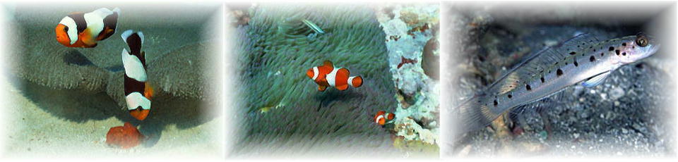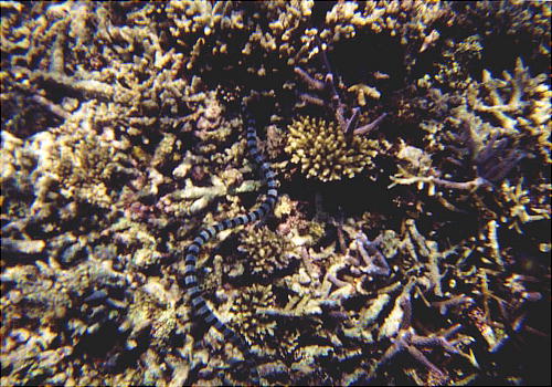 ウミヘビ(上右)は縞模様で、ほんとに蛇のようだ。毒があるから触ってはいけない。