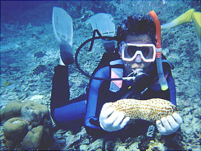 ナマコを抱える哲平。これは食べられないナマコ。