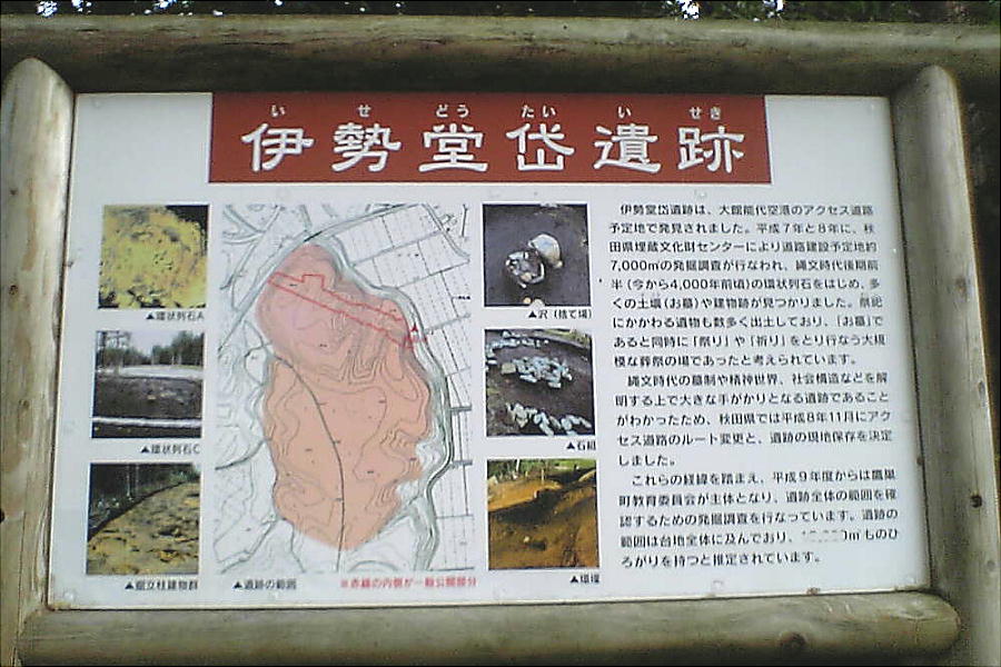 伊勢堂岱遺跡(いせどうたいいせき)は、北秋田市郊外の標高40〜45mの台地上に位置する、縄文時代後期前半(今から