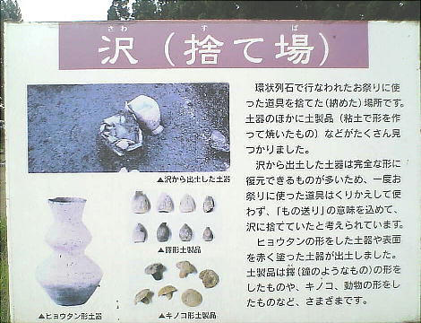 ストーンサークル近くの沢やフラスコ状土坑からは板状土偶やヒョウタン型土器、キノコ型土製品なども発見されており、捨て