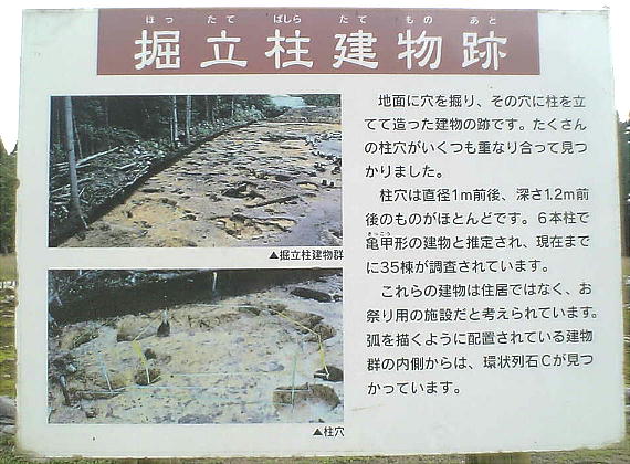 設に先立つ発掘調査で発見された。今日迄、約7,000uが発掘調査された。その結果、環状列石や配石遺構、掘立柱建物