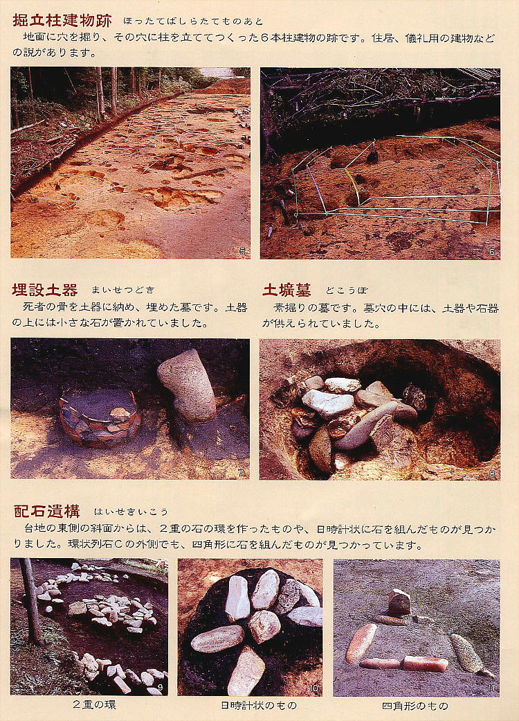 墓(配石遺構)や墓穴(土壙墓)、埋設土器などが発掘され、多くの建物跡も見つかり、又祭祀にかかわる遺物も数多く出土
