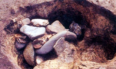 石がある。これらの焼けた石は、どこかで焼いてから持ってきたものらしい。何のためにそんな事をしたのか。