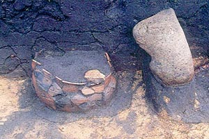 埋設土器(上右)。死者の骨を土器に納め、埋めた墓。土器の上には小さな石が置かれていた。