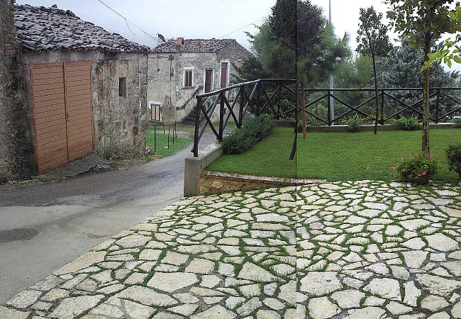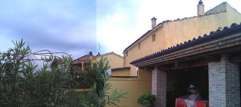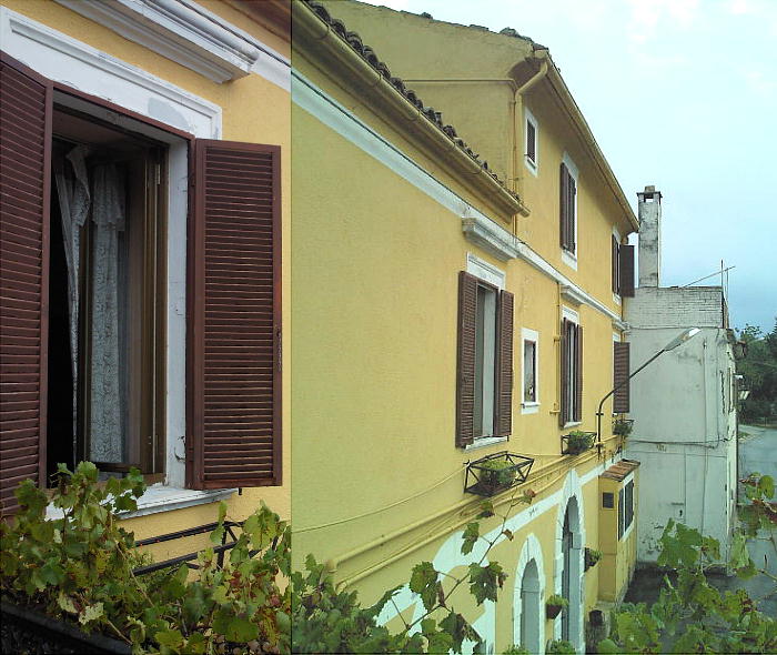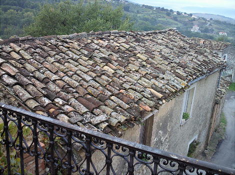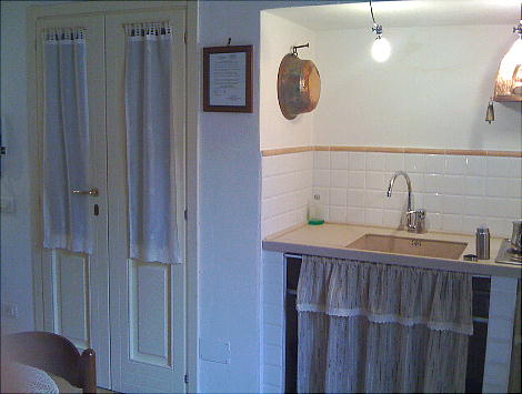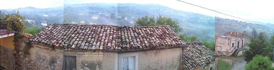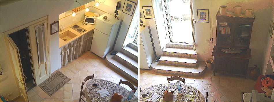 道を挟んで、部屋のハス向かいに石積みの小屋があるが、この小屋の屋根と我々の部屋のキッチンとがテラスで結んであった。