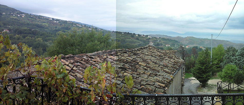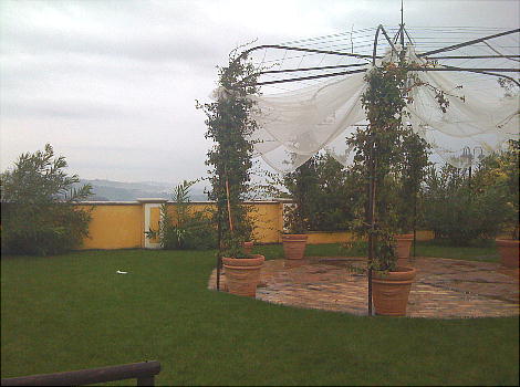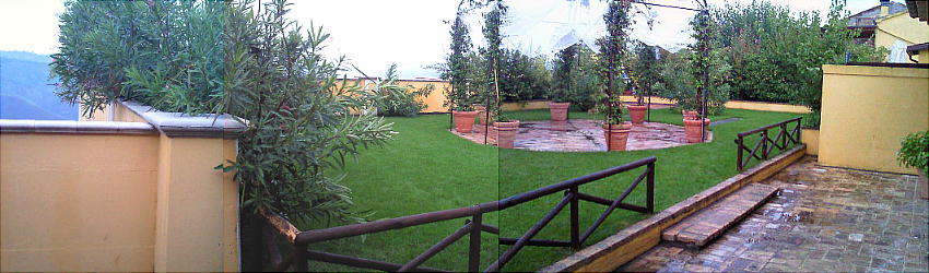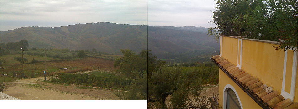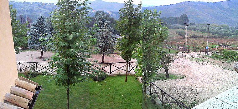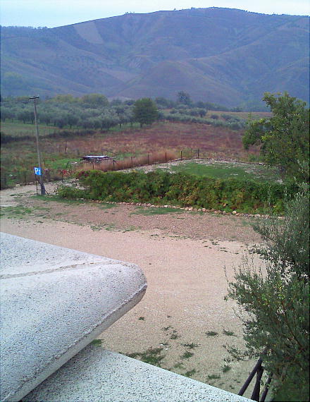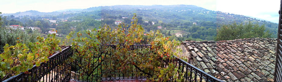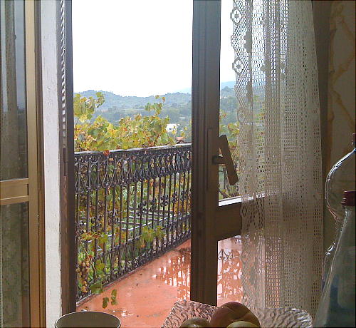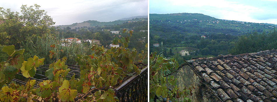 昨夜からの雷が、まだ時折鳴っている午前7時頃目覚めて、ベランダへ出た。細かい雨が振り続く、ウンブリアの山並みが美しい。