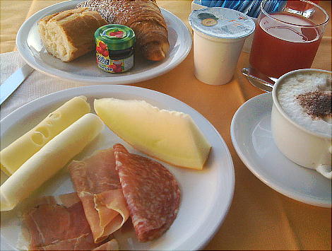 の宿泊客がいる。イタリアではどこでも、朝食は実に豊富なメニューである。ロンドンの朝飯とは大違い。