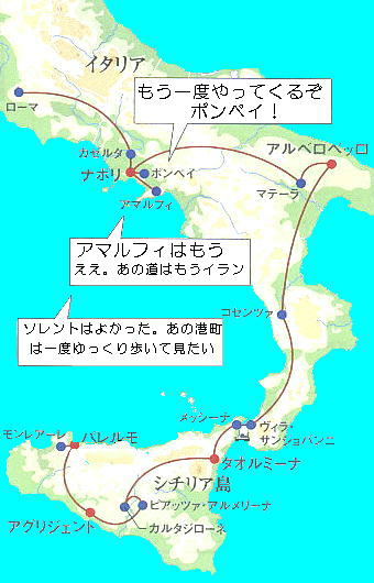 昨日は特にひどかった。私はポンペイが今回の一番の目的だと言っているのに、地道を行き、あっちの街こっちの街に寄るのであ