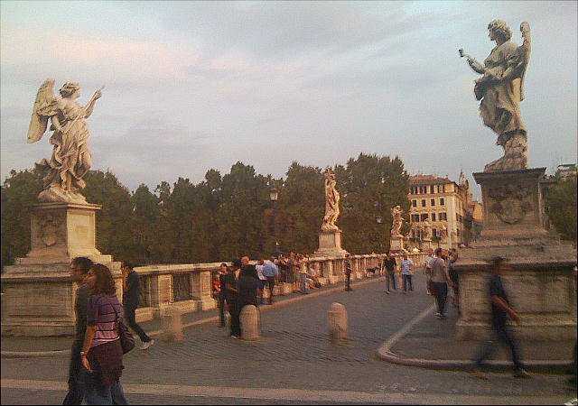 サンタンジェロ橋には天使や偉人の彫像が並ぶ。橋のたもとはカップルで一杯。