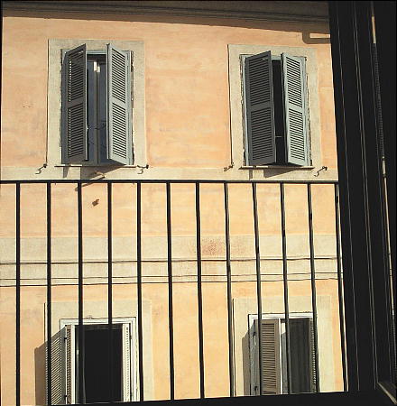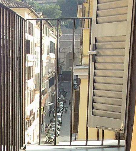 ホテルの窓から見た光景。下の狭い道を車がビュンビュン通る。上右の写真、通路を真っすぐ行った所がスペイン広場だ。